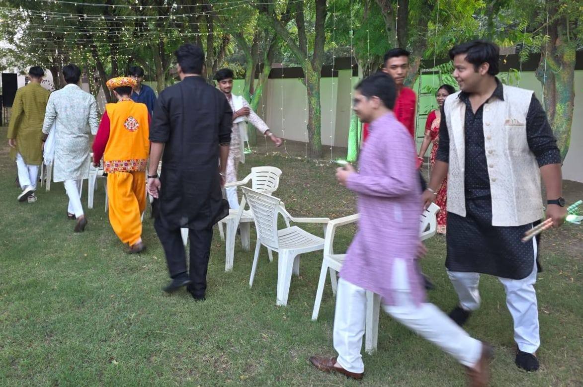 Picture this: the entire open lawn transformed under fairy lights and vibrant mandap drapes in saffron, pink, and royal blue. Giant cut-outs of Goddess Durga watched over us as we kicked off with the traditional Aarti at 7 PM sharp. Faculty, students, alumni—everyone circled up, clapping and chanting, setting the spiritual tone before the madness began.